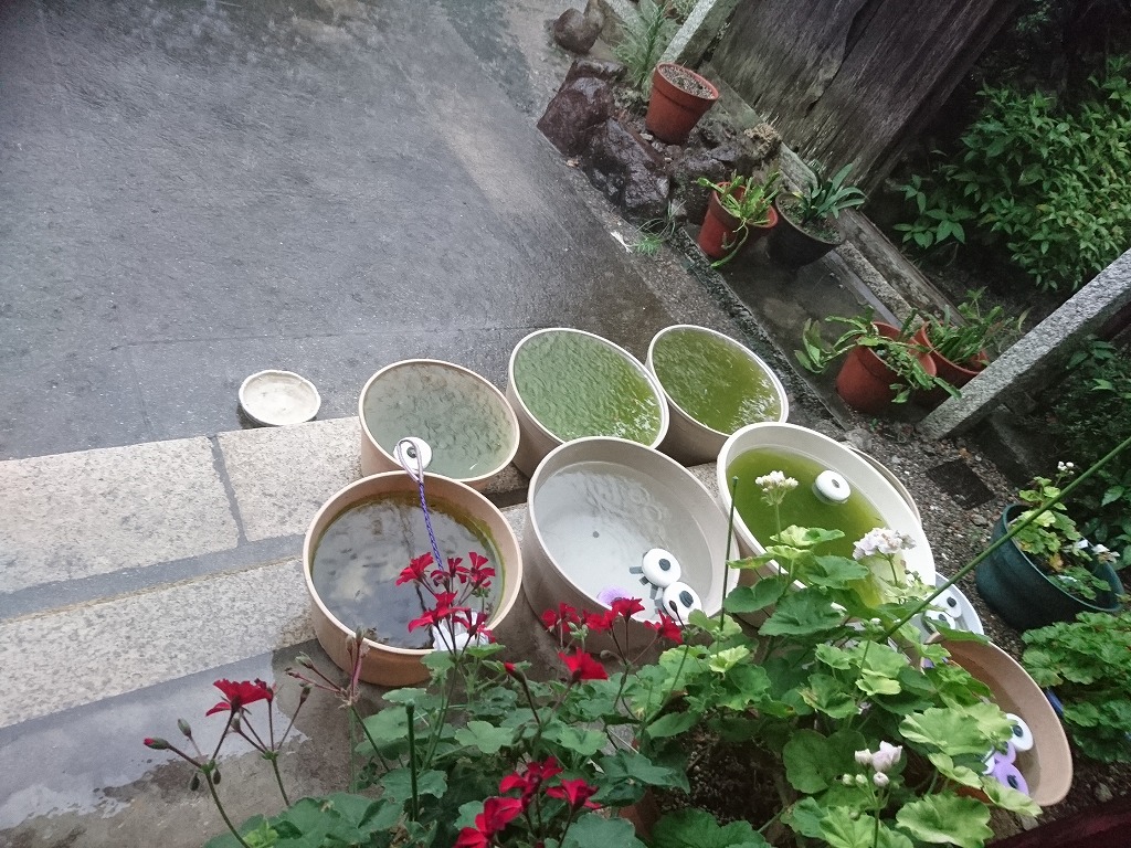 先日の豪雨で庭に一番近いメダカの桶で1匹を残し20数匹が死滅