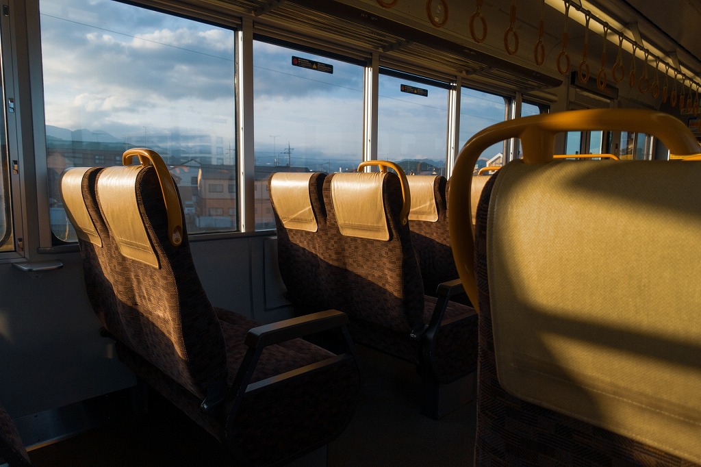 重い荷物を両手で抱えてるため、手すりを握れず、荷物があるから窓側の席へも行けない