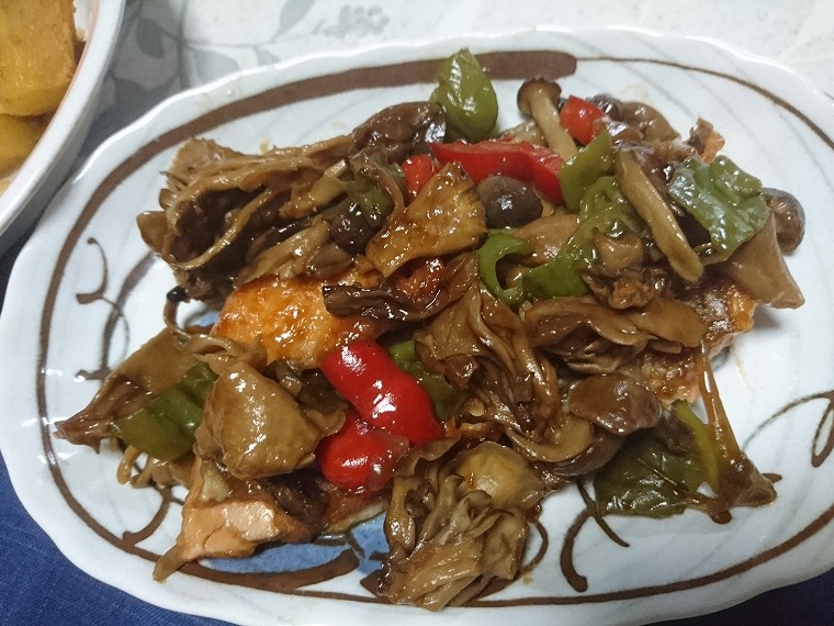 夕食に鮭と「舞茸のオイスターソース照り焼き」なるものを作りました。