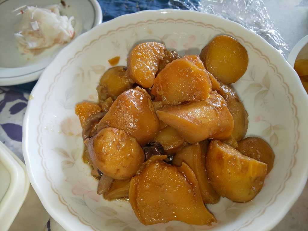 日記今日の朝食のテーブルに芋が炊かれて置いてあった